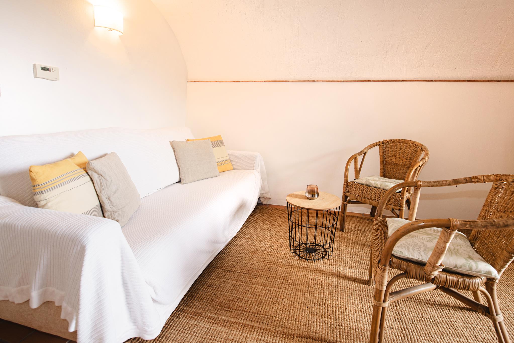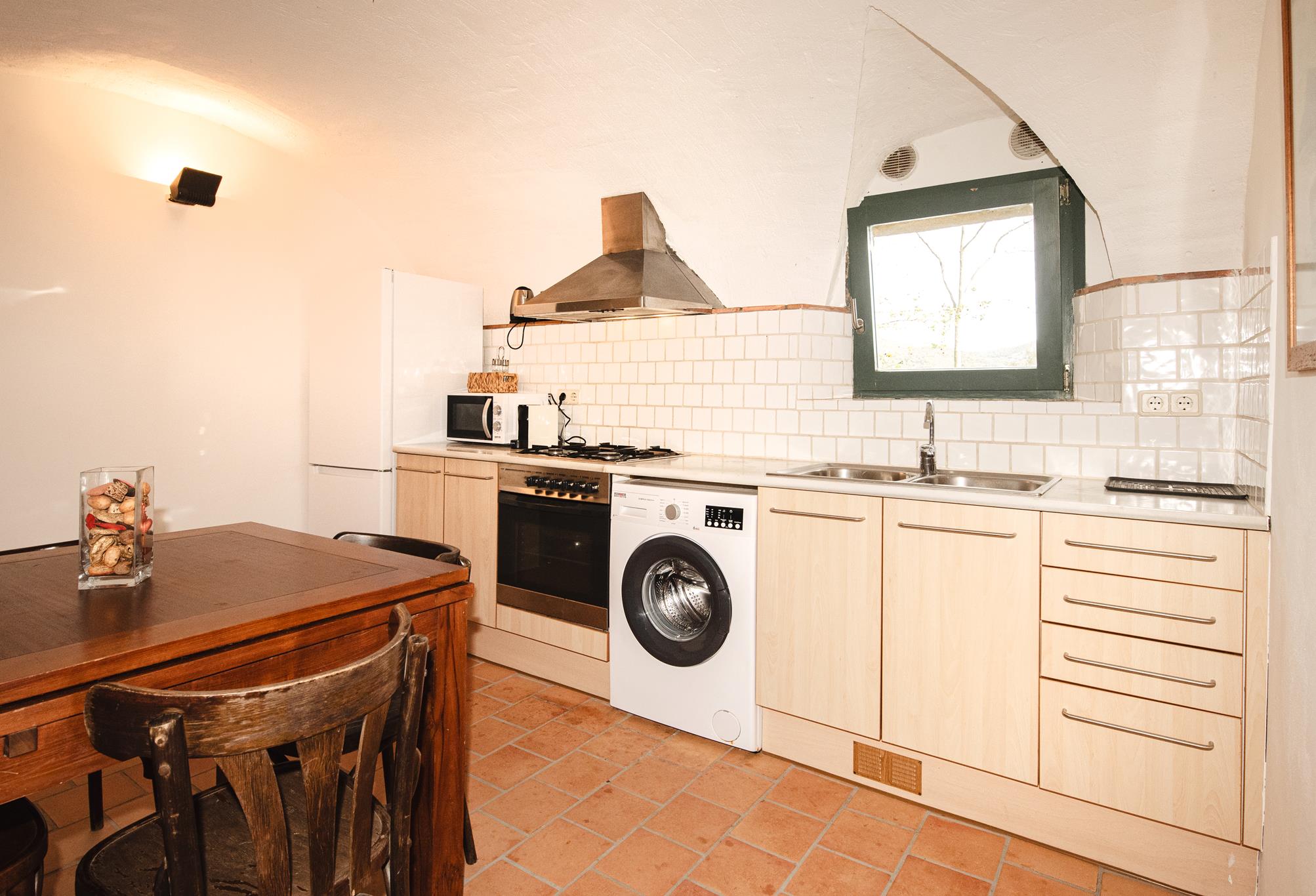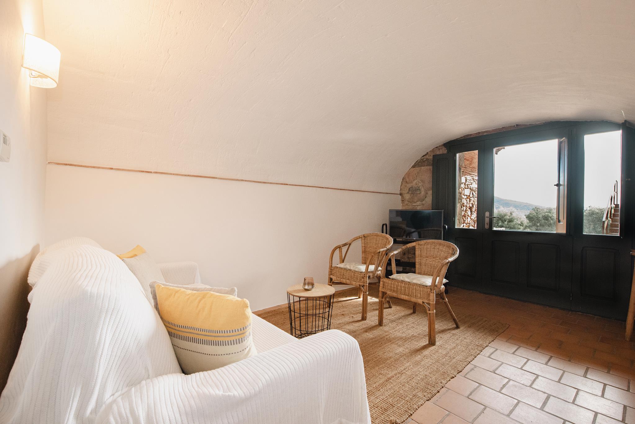 La Cort té una capacitat per 4 persones. Disposa de 2 habitacions dobles, 1 bany, cuina menjador i sala estar oberta a l’espai exterior sota volta.